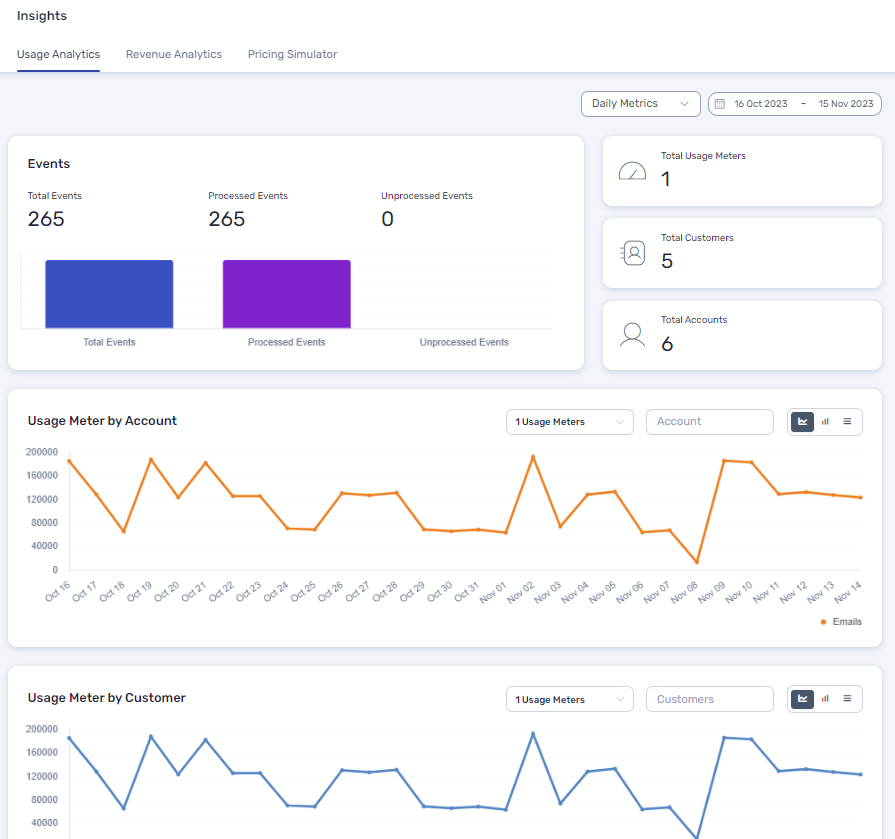 This is the 1st screen upon logging into your Togai dashboard. Once the configurations are done and the events are flowing through, you can filter based on a date range and view the daily or hourly metrics for events, usage and revenue data points for accounts and customers. You can also view the real-time usage and revenue metrics (time-series data) for each and every billable item or a group of billable items.