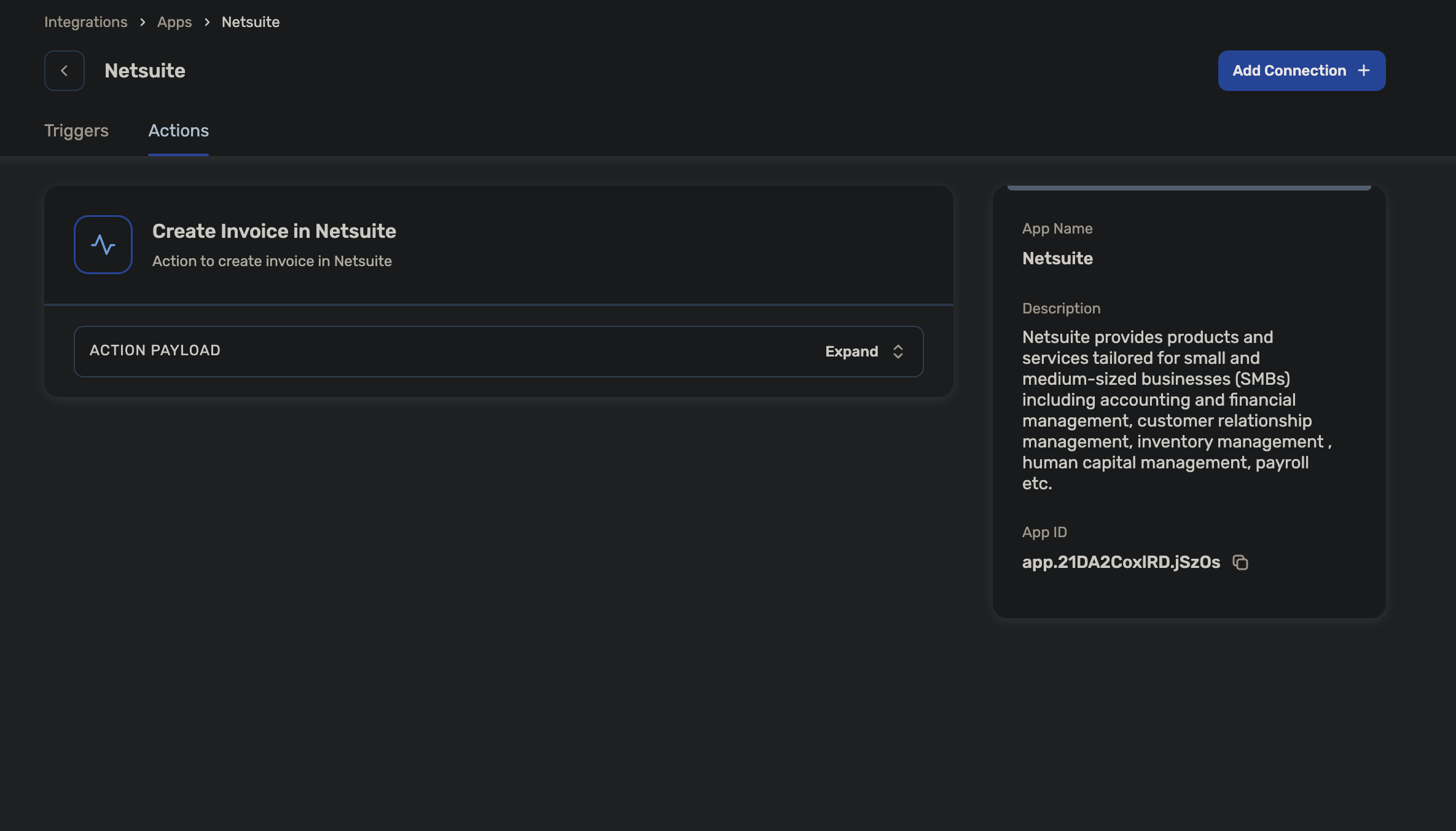 There are 2 Actions and 1 Triggers available for Netsuite currently. The way it works is, If