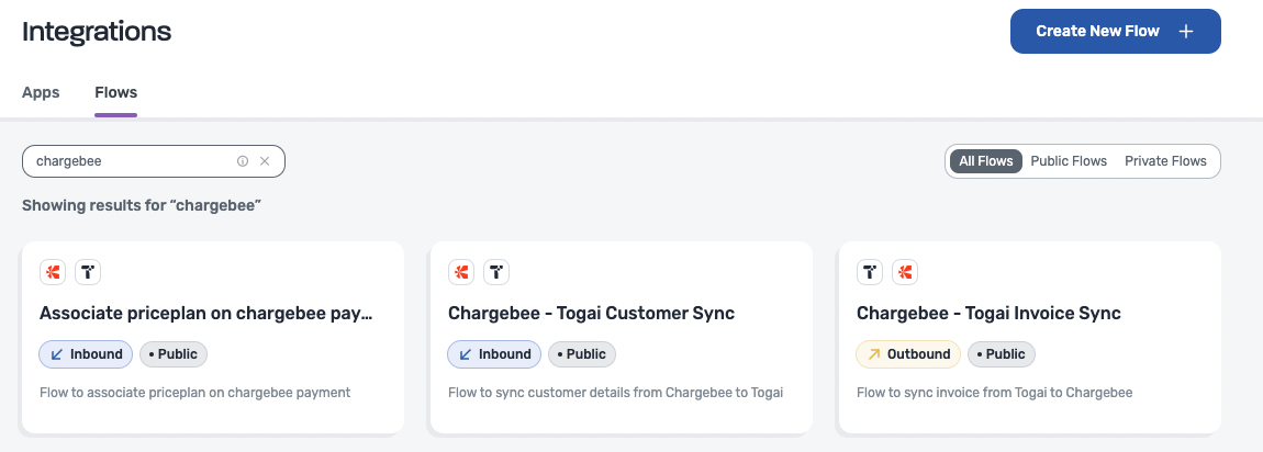 - Inbound Flow - based on third party events(eg: Chargebee), actions are triggered in Togai