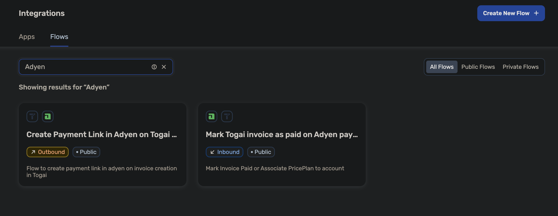 An example flow would be: On creation of an invoice in Togai, create payment link Adyen.