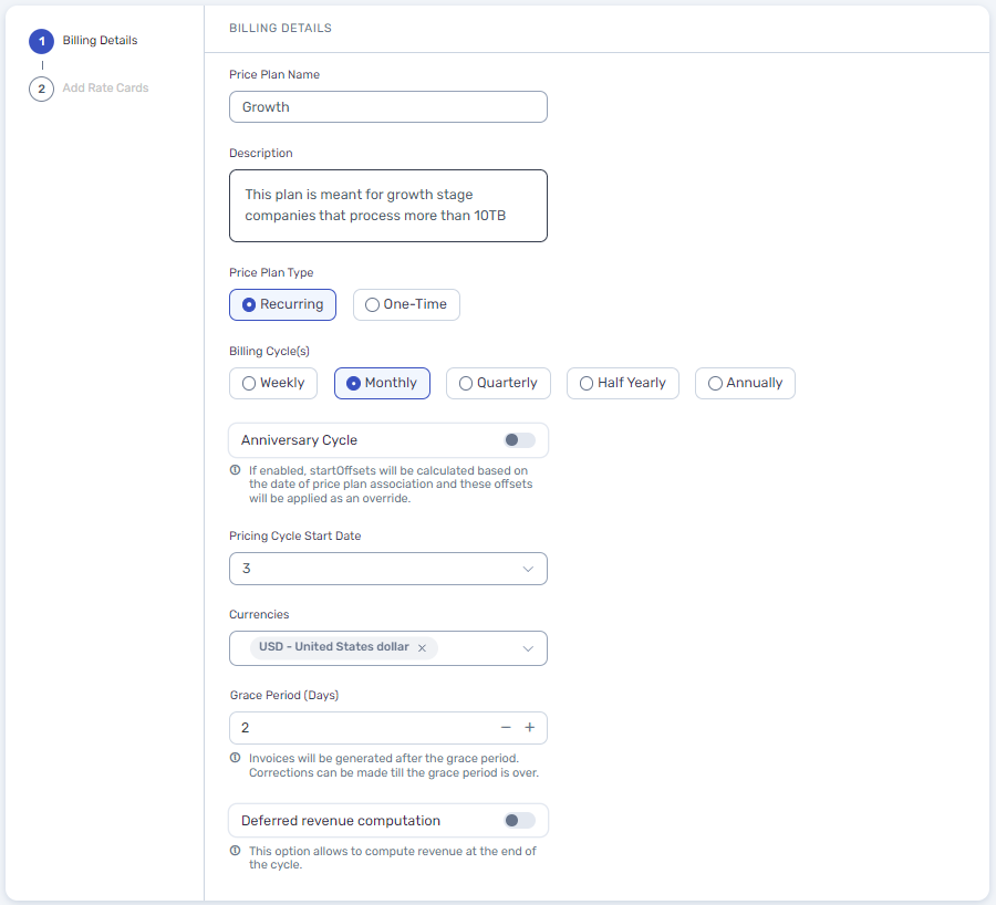 - Deferred revenue computation - This configuration allows you the flexibility to change your price plan during an Ongoing billing cycle and apply changes from the start of the ongoing cycle and re-rate the customer’s usage. Ongoing billing cycles are the ones where the Invoices are not yet due and are in an ‘Ongoing’ state. By enabling this configuration, you can override a customer’s price plan and make any changes and apply them from the start of the current ongoing cycle.